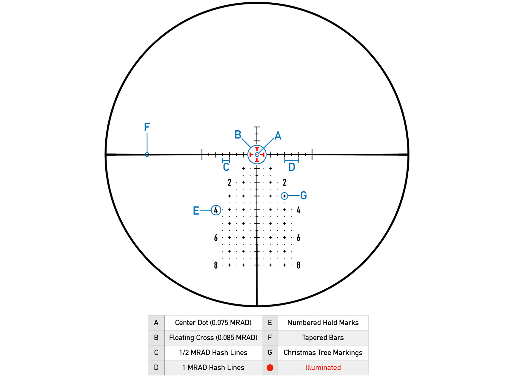 The fine center dot provides a precise point, while the thicker floating cross just outside it remains clearly visible even at minimum zoom. The floating cross also creates finer 0.25 MRAD divisions along both axes, allowing for more precise holds close to the center without the need for extra hashes. The Christmas Tree uses thicker crosses to mark full MRAD hold points, making them visible at lower magnifications, while the smaller 1/2 MRAD dots disappear as you zoom out.